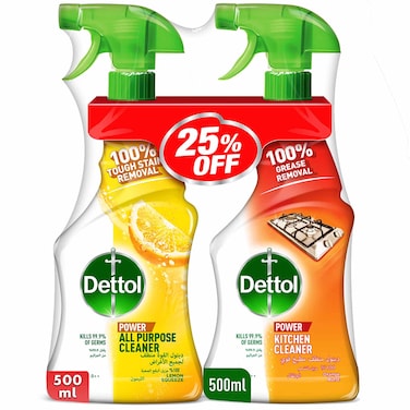Dettol All Purpose Cleaner Spray Bottle, Lemon Scent + Dettol Kitchen Cleaner Spray Bottle, Orange Scent, 500ml x 2