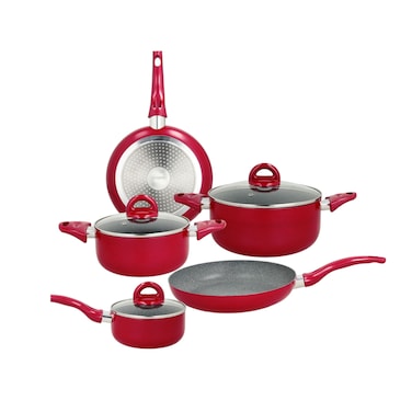 Suitable for all types of hobs, including induction. High thickness anti-deformation bottom. 4-layer reinforced PFOA free, non-stick and scratch-resistant internal coating with marbled effect. High temperature resistant exterior. Ergonomic handles in anti-slip and anti-scald painted Bakelite. Lids in tempered glass to visually check cooking.