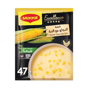- شوربة الذرة بالدجاج من ماجي إكسلانس كريمية الملمس ولذيذة المذاق. إنه مصنوع من دجاج حقيقي ولا يحتوي على نكهات أو ألوان صناعية. إنه حلال معتمد وخالي من أي مواد حافظة مضافة. وهو مصدر جيد للبروتين.