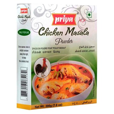 • Priya Chicken Masala made with the best ingredients to give you the taste of most loved hot and spicy dish. It has maintain freshness and flavour of the spices while processing. This Masala pack is free from preservatives and has no artificial colours and flavours.