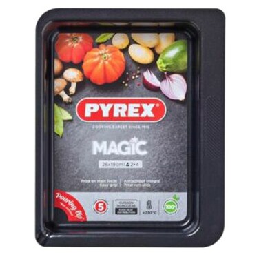The 26cm magic rectangular roaster is made from carbon steel metal with a non-stick coating. It features an easy-grip handle on one long side allowing you to transfer in and out of the oven with ease. Its size and depth make it ideal for cooking the perfect roast potatoes