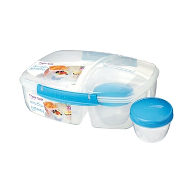 Divided into 3 compartments. 2 smaller zip compartments with 1 large compartment. Includes 1 cup with screw cap