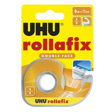 Rollafix double-sided adhesive tape, high adhesive strength, can easily be torn off by hand, completely transparent, for smooth surfaces, clean, simple and fast, adhesive tape width 12mm