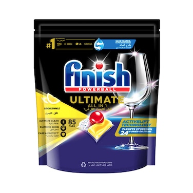 Finish Ultimate Dishwasher Tablets Lemon Sparkle Scent 2x More Cleaning Power 85 Tabs