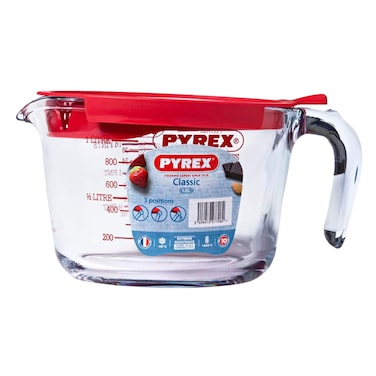 • Pyrex has enhanced its iconic 1L measuring jug by adding a very practical plastic lid. The lid features an integrated sieve with 3 positions to allow slow or quick flow of the liquid and also to close the measuring jug to conserve the preparations. Easily-visible measuring scale ET suivi du dosage. Ideal to store in the refrigerator and freezer.