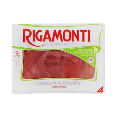 • The surprising pleasure of a tasty alternative, Carpaccio of Bresaola Rigamonti is prepared with the heart of beef topside, masterfully flavoured, delicately massaged and seasoned slightly in the crisp cool air of our alpine valleys. It contains only 2% fat and is rich in protein, making it an extremely healthy and versatile food, ideal for an appetising starter or a second course which is quick to prepare and elegant to taste.