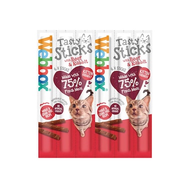 - Webbox Tasty Sticks are a complementary pet food for cats and kittens. Perfect to feed at any time as a tasty, chewable snack or treat. Gently cooked to produce a delicious, moist, meaty treat for your cat or kitten. Each Tasty Stick is individually wrapped for freshness – to open, simply tear open from the top of the pack.