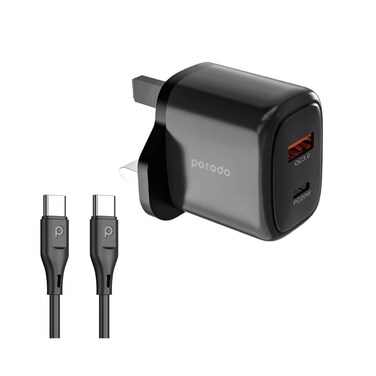 Porodo 20W+QC USB A+C Charger UK with C-C 1.2M Cable - Black