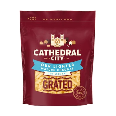 • Smooth and mellow grated Cathedral City Mature Lighter Cheese with all of the flavour but 30% less fat so you don't have to compromise on taste.