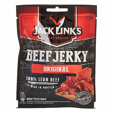 - Jack Link's Beef Jerky is the finest beef, refined with the choicest spices and then leisurely air-dried according to the old family recipe. It takes as much as 186 g of top grade beef to produce just 100 g of top-class Jack Link's Beef Jerky. Jack Link believes that all of this care and patience produces probably the very best beef strips in the world. Protein rich with only 4, 0% fat, Jack Link's Beef Jerky is the perfect snack for when you're on the move or playing sports.