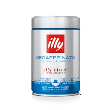 - The illy Ground Decaffeinated Coffee contains less than 0.05 percent caffeine. This medium roast coffee is suitable for all preparations and offers a great aroma.