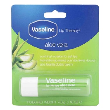 - Vaseline Lip Therapy Aloe Vera Stick, has a soothing effect leaving your lips feeling soft & hydrated. Vitamin E - helps to care for healthier lips, Petroleum Jelly - locks in moisture, Aloe Extract - helps to soothe & hydrate dry lips.