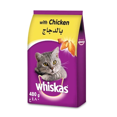 - WHISKAS® Chicken provides 100% complete and balanced nutrition for your adult cat. It contains tasty filled pocket kibbles - crunchy on the outside with a soft and delicious centre. The specially designed kibble provides a gentle abrasive effect to help clean your cat's teeth and support healthy gums.