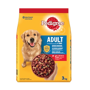 - Pedigree Liver & Vegetables Flavor Adult Dog Food, 3kg, Pedigree is a complete and balanced food for your dog. Made with high quality ingredients, Pedigree provides dogs the 5 Signs of Good Health – healthy skin and coat, strong bones and teeth, healthy digestive system, strong muscles and strong muscles. It contains the optimal blend of Omega 6 and Zinc, which are proven to provide a healthier and shinier coat to dogs.
