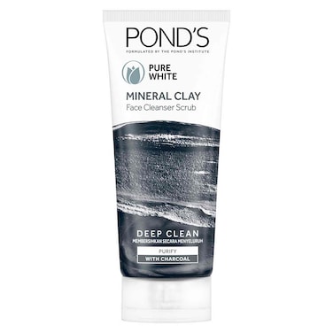 - Pond's pure white mineral clay face cleanser scrub is a facial cleanser with a unique texture clay to foam specially formulated with 100 and natural moroccan clay which can bind dirt 4x better. Equipped with charcoal powder and natural scrub granules that can remove excess oil from the face and make the face brighter and smoother. How to use: apply cleanser to dry face first evenly. Then wet your face with a little water with a massaging motion until the clay texture turns into foam. Rinse face with water until clean. Suitable for: oily skin ingredients: water, glycerin, myristic acid, stearic acid, kaolin, potassium hydroxide, palmitic acid, bentonite, lauric acid, glycol stearate, prunus armeniaca seed powder, cocamidopropyl betaine, titanium dioxide, perfume.