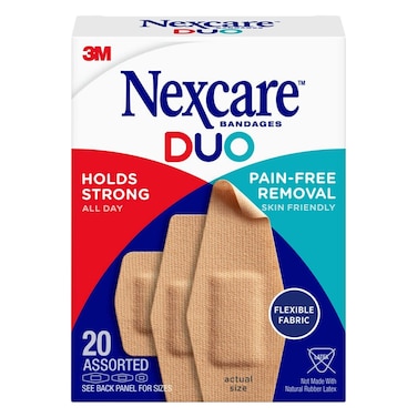 - Long lasting adhesive allows for wear up to 24 hours, but is gentle enough to allow for easy removal, leaving no gunk. Flexible fabric strips conform to skin stretching, bending and flexing to move with you, while pad cushions the wound. Keep your first aid kit stocked with Nexcare duo bandages.