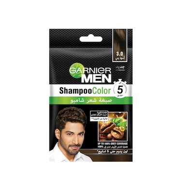 - Garnier Men Shampoo Colour 3.0 Black Brown. Natural Hair Colour with coffee extract and nourishing Argon Oil that is easy to apply just like a shampoo for men. A natural look in just 5 minutes with 100% grey coverage.