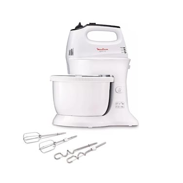 - Features & Functions Quickmix hand mixer with stand bowl covers all your baking needs Effortless and hands-free preparations thanks to the 3.5L auto-rotating stand bowl For more versatility, the mixer is utilizable without its bowl and holder 5 speed settings and a turbo function to easily adapt to every recipe Set of stainless steel beaters for batters, cakes mixes, whipped egg whites and cream Set of stainless steel dough hooks for effortless kneading of pizza or bread dough Power: 300 W Convenience: stable rest position on the hand mixer ensures your countertop stays clean
