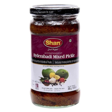 • Shan Hyderabadi Mixed Pickles is a chunky mix of sour mangoes in pickling spices.