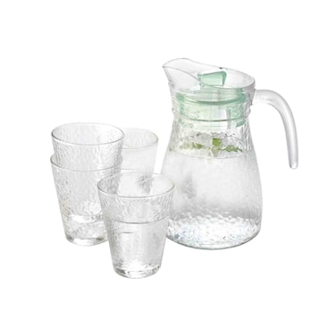 - Refresh yourself any day with an ice cold Pitcher of your favorite beverage and store it for later with this. This Pitcher set are made from durable, transparent glass. A lined pattern. With an easy-pour spout and side handle for effortless serving, the Pitcher And Cups have a classic design that will complement any tabletop.