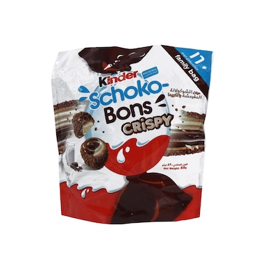 - Kinder Schoko Bons crispy is about celebrating joy and togetherness with friends and family. Kinder Schoko Bons crispy explores different sharing occasions among kids, friends and families across wider age groups. The brand leverages this joyous occasion because quality time must go along with a delicious treat.