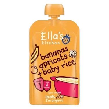 - Ella's kitchen organic bananas, apricots and baby rice smoothie has 100 percent organic bananas, apricots and baby rice with nothing else added, not even water. It is made with only certified usda organic ingredients. The ingredients and textures are suitable for babies from 4 months, stage 1. It has no added sugar or salt and contains naturally occurring sugars. It has no big lumps and nothing artificial, just yummy organic food for babies.