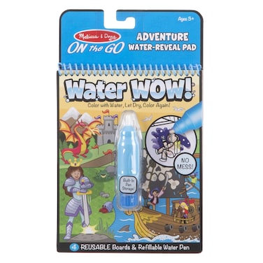 - No mess painting for kids. This exciting paint with water coloring book includes four reusable pages and a refillable water pen. Simply use the pen to color in each scene details and vibrant color appear with every stroke. Then let the page dry to erase the pictures and fill them in again and again. This adventure themed book includes four scenes to color and a search and find activity for each scene. The chunky sized water pen is easy for kids to hold and stores neatly right in the front cover, so water wow. Books make ideal travel activity books and travel toys for kids.