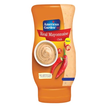 - American Garden Real Mayonnaise Chili is a must-have ingredient. This chili mayonnaise contains no artificial colors or artificial flavors and is gluten-free and dairy-free. It is the perfect condiment, sauce, or dressing to dip, spread, or add to your favorite salads, vegetables, fries, and many more foods.