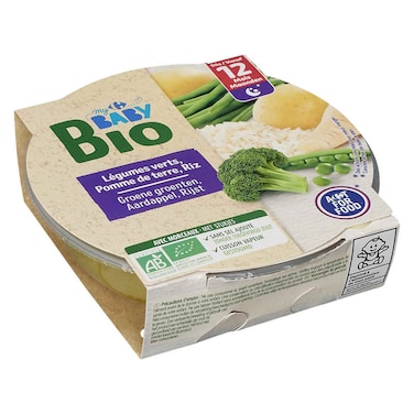 - Baby food made from potatoes, green beans, broccoli, rice and peas, from organic farming.
