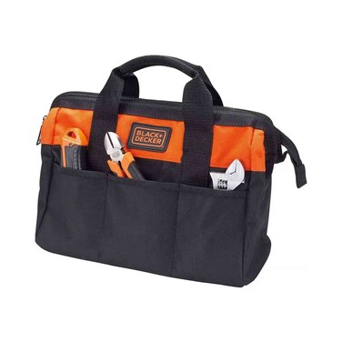 The Black+Decker bdst73820-8 is a 12" tool bag. The soft materials used are lightweight and durable. The bags are resistant to wear and tear. The bag mouth opens up to 13 cm. The bag has storage pockets and straps on the inside for an organized tool kit. There are three additional pockets on the outside for convenience and easy access. The handles have a cushioned grip for added comfort