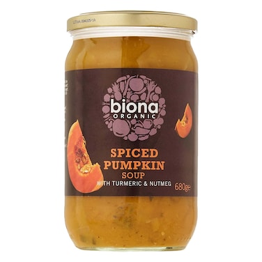 - High quality organic gourmet soup in jar. Spiced pumpkin soup is lightly spiced with turmeric and nutmeg, the perfect winter warmer. Biona high quality organic gourmet soup in jar. Spiced pumpkin soup is lightly spiced with turmeric and nutmeg, the perfect winter warmer. Contains certified organic ingredients. Organic spiced pumpkin soup is suitable for vegans.