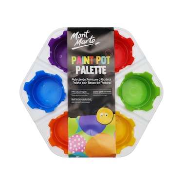 • This vibrant paint pot palette has 7 coloured lift-out paint pots in Green, Blue, Purple, Red, Orange, Yellow and White. They can be used for paint and/or water to keep your art space clean and tidy. The colours will inspire and help with colour coordination. They are easy and convenient to clean up. Ideal for home and school environments
