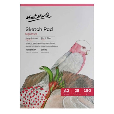 Sketch Pads have 25 sheets of 150gsm, acid free, smooth textured paper. This paper is a wonderfully versatile medium which can be used with a huge range of sketching media and craft projects. This sketch pad's paper is a crisp, bright white and has very fine-toothed texture. The sheets are tape bound which makes removing them quick and easy. The sheets are also supported by a 2mm (0.08in) thick backing board. Mont Marte Sketch Pads give a helping hand to the beginner artist with practical drawing tips on the inside cover