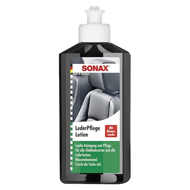 - Lotion for the gentle cleaning and care of car interior fittings, motorbike leathers and other smooth leather. Freshens up colours and restores natural leather scent. Effortlessly removes dirt, oil and grease. Makes the leather especially supple and prevents it from cracking. Silicone waxes and beeswax give the leather excellent and long-lasting protection and a water repellent effect