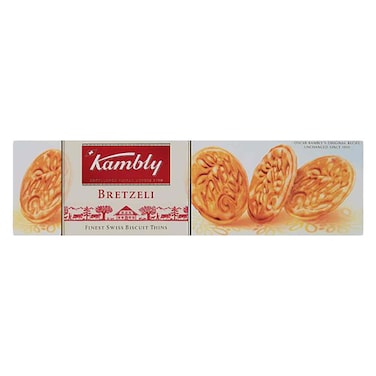 - Kambly bretzeli finest swiss thin biscuits is a crispy crunchy delight and a perfect companion for tea or coffee. Enriched with natural fiber and made with the best quality golden wheat, these biscuits can ensure good health.