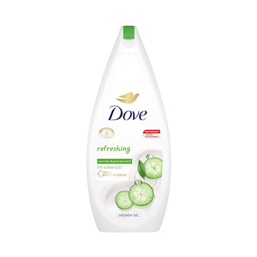 - This Dove Shower Gel is ideal for a refreshing morning shower, combining a fresh scent with a nourishing and moisturizing formula. In fact, this shower gel has a sulfate-free formula, boasting mild and naturally derived cleansing agents. So, it provides a gentle but effective wash that doesn't strip the skin of its natural moisture. It is also rich in hydrating ingredients, containing a blend of three skin-natural moisturizers that help to nourish and soften the skin. Last but not least, cucumber and green tea help to protect, soothe and moisturize the skin, delivering a refreshing feel and fragrance that will leave you energized.