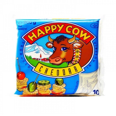 - Happy Cow Slice Cheddar Cheese is a rich source of calcium, fat, phosphorus, and protein.