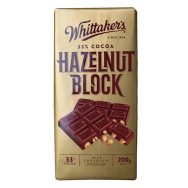 - The Whittaker's Hazelnut Block Milk Chocolate Bar is premium chocolate made in New Zealand. Its unique composition of 34% cocoa milk chocolate surrounds the crunchy core of roasted almonds, to offer a pure delight.