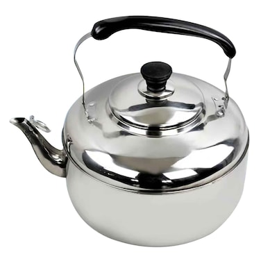 - Whistling tea kettle is made out of high quality 0.4mm stainless steel and features a nylon handle for easy grip and comfort. This sleek whistling tea kettle will add style to your kitchen with its chrome design. You don't need to worry about when the water is boiled, it will whistle when its done. The cool handle make carrying easy off the stove. The tip has a latch for east pour. Easy to clean.