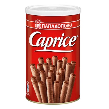 • Caprice wafer roll with hazelnuts cream is a crispy wafers with cocoa and hazelnut filling that melts in the mouth and awakens the senses. One is never enough with this unique irresistible recipe. A perfect choice for you and your friends, as a daily indulgence but also on more special occasions. Papadopoulos caprice classic wafer rolls is a very delightful treat and famous for its cocoa hazelnut filling.