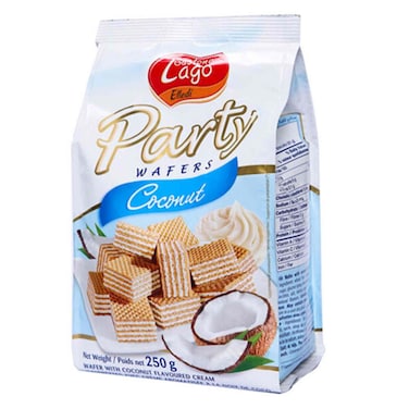 • Let yourself be tempted by the irresistible goodness of party coconut. Tasty bite size wafers filled with a velvety cream. Party coconut make every moment of your day special, enjoy them at home, at work, outdoors, share them with family, at your “parties” with friends, while watching a good movie, with a glass of milk or a cup of ice-cream. Party wafers, one is never enough.