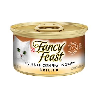 - Fancy Feast Grilled Liver & Chicken Feast is a highly palatable, gourmet wet cat food made for adult cats. Crafted with small, delicate bites with liver and chicken, slow-cooked and served in a thick gravy. A glorious feast for your cat! All FANCY FEAST Classic recipes are 100% complete and balanced, with the goodness of high protein and the essential vitamins and minerals your cat needs, making mealtime delicious and nutritious.