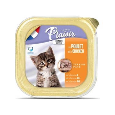 - Plaisir offers you a unique recipe with Chicken and milk for your kitten. </br> It is specially designed to promote good growth: adapted vitamin complex, protein rate of 11% and a fat rate of 6%. </br> He will love it!
