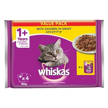 - Whiskas Chicken in Gravy is a complete and balanced wet cat food recipe that provides moisture and nourishment for a healthy and active cat. Whiskas cat food Chicken in Gravy comprises of flavorful chicken chunks in an appetizing gravy packed with proteins, fats, vitamins and minerals so that your cat stays fit and happy.
